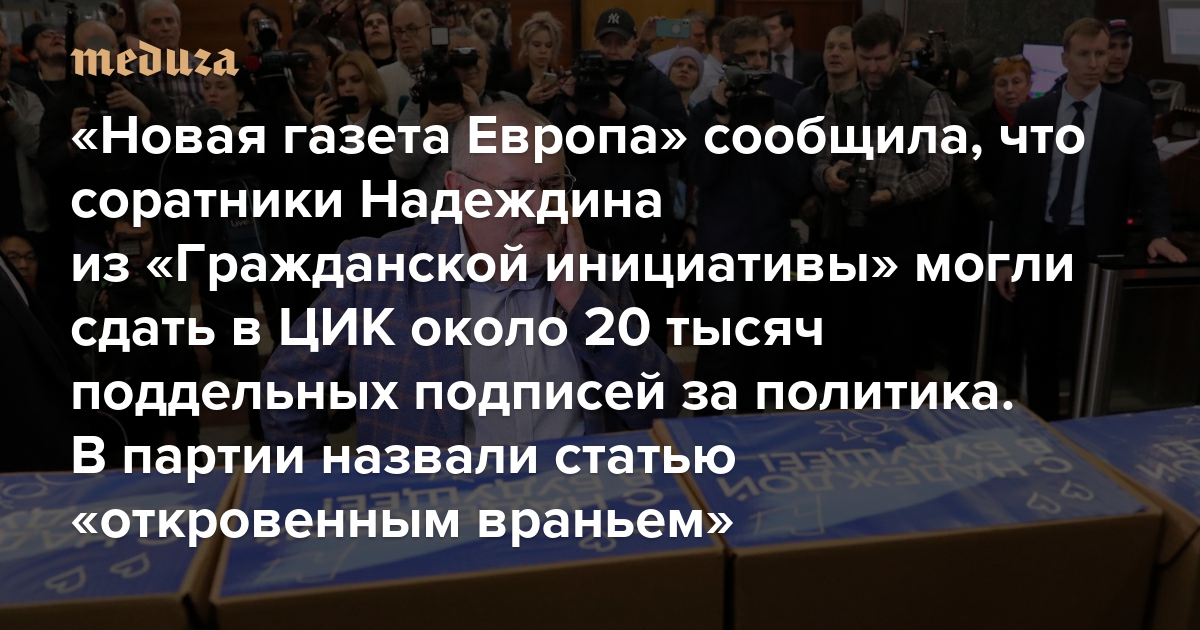 «Новая газета Европа» пишет, что соратники Надеждина из «Гражданской инициативы» могли сдать в ЦИК 20 тысяч поддельных подписей за политика Партия называет это «откровенным враньем». Максим Кац утверждает, что изданию заплатили