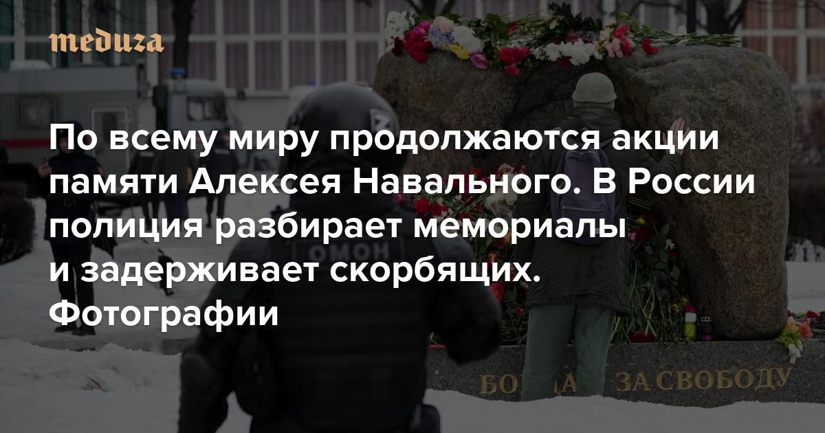 По всему миру продолжаются акции памяти Алексея Навального. В России полиция разбирает мемориалы и задерживает скорбящих. Фотографии
