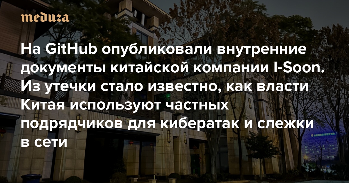 16 февраля на сайте GitHub были опубликованы внутренние документы шанхайской компании I-Soon, специализирующейся на кибербезопасности. Из них выяснилось, что эта компания предоставляет хакерские услуги государственным заказчикам, включая министерство общественной безопасности КНР (аналог МВД — прим. «Медузы»), а ее деятельность нацелена на атаки на иностранные государства и организации, а также на оказание помощи властям Китая в слежке за активистами внутри страны и за ее пределами. Статьи об этой утечке среди прочих опубликовали The New York Times, Associated Press и The Washington Post.