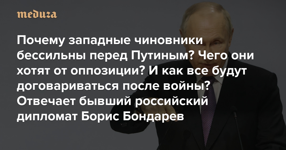 Почему западные чиновники бессильны перед Путиным? Чего они хотят от оппозиции? И как все будут договариваться после войны? Отвечает бывший российский дипломат Борис Бондарев. Он ушел в отставку после начала вторжения
