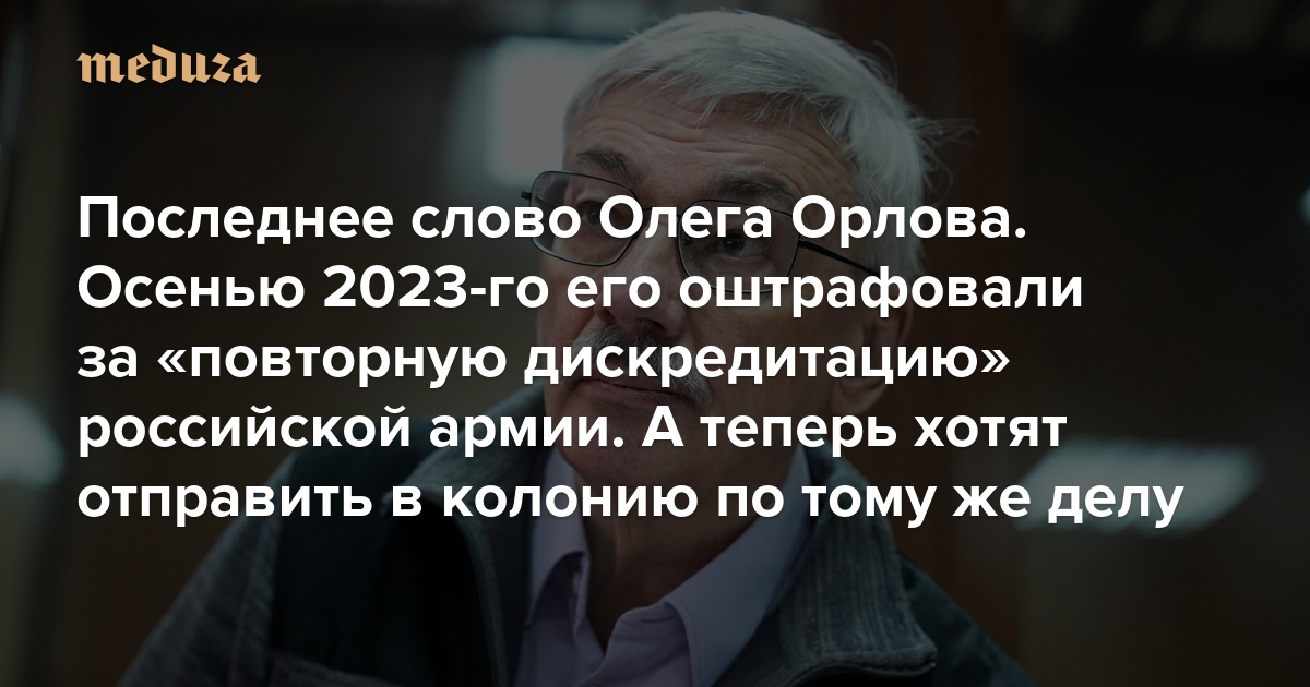 «Я обращаюсь к вам, Ваша честь, и к представителю обвинения. Вам самим не страшно?» Последнее слово Олега Орлова. Осенью 2023-го его оштрафовали за «повторную дискредитацию» российской армии. А теперь хотят отправить в колонию по тому же делу
