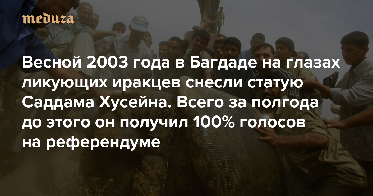 Двадцать один год назад — 20 марта 2003 года — США и их союзники начали вторжение в Ирак. Поводом стали разработка химического оружия, которую якобы вел диктатор Саддам Хусейн, и его предполагаемые связи с «Аль-Каидой» (как выяснилось впоследствии, эти обвинения со стороны американских властей были ложными). Менее чем через месяц войска США захватили Багдад — и режим Саддама пал. Символом этого события для всего мира стали видеокадры, на которых американские военные сносят статую президента в центре Багдада — под одобрительные крики тысяч ликующих иракцев. Тех самых иракцев, которые, как утверждала пропаганда, безоговорочно поддерживают своего лидера: всего за полгода до этого на референдуме о продлении срока своего правления Хусейн набрал 100% голосов. «Медуза» вспоминает, как проходило то голосование — и к чему оно привело.