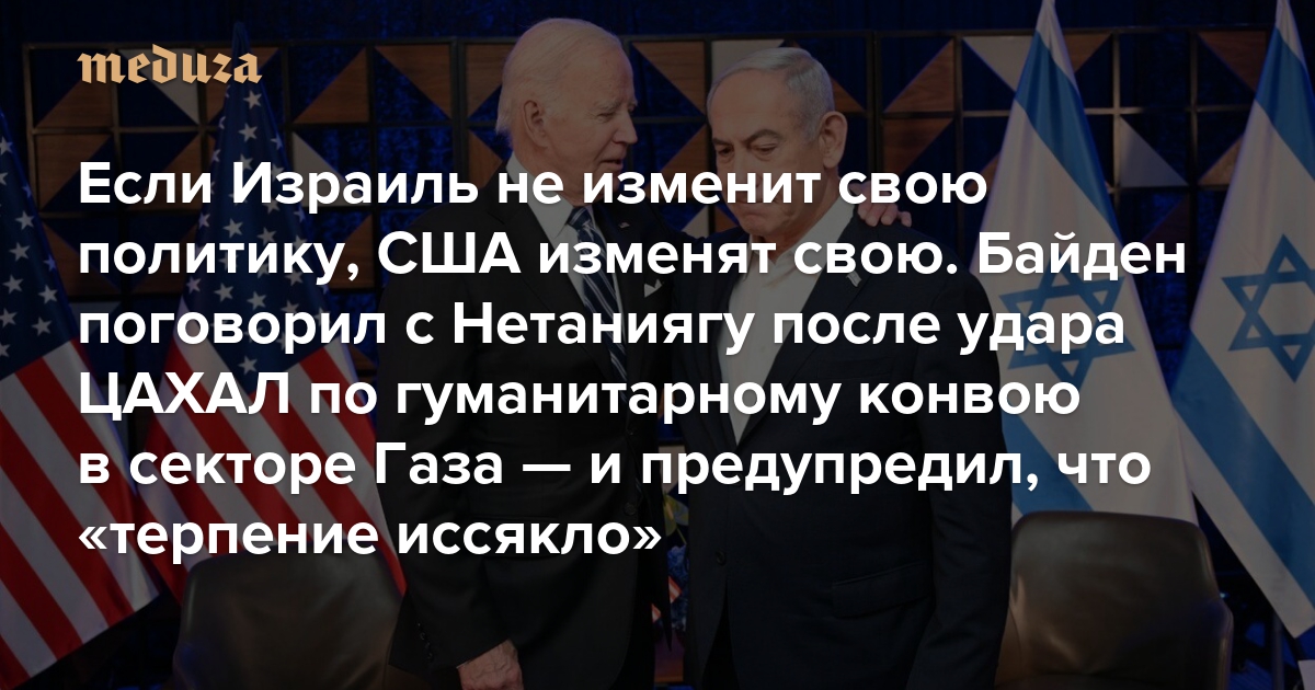 Если Израиль не изменит свою политику, США изменят свою Байден поговорил с Нетаниягу после удара ЦАХАЛ по гуманитарному конвою в секторе Газа — и предупредил, что «терпение иссякло»