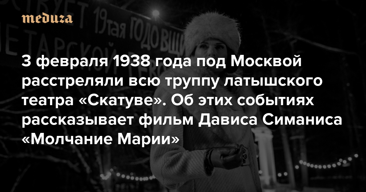 3 февраля 1938 года под Москвой расстреляли всю труппу латышского театра «Скатуве» Об этих событиях рассказывает фильм Дависа Симаниса «Молчание Марии» — изысканный по форме, ясный по содержанию