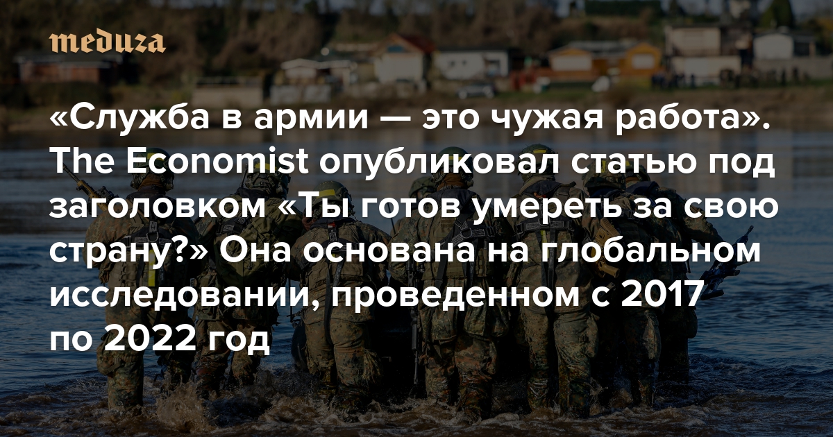 «Служба в армии — это чужая работа» The Economist опубликовал статью под заголовком «Ты готов умереть за свою страну?» Она основана на глобальном исследовании, проведенном в 2017-2022 годах