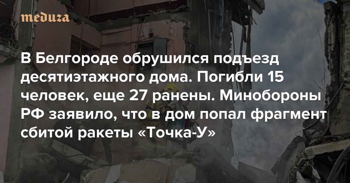В Белгороде обрушился подъезд десятиэтажного дома. Погибли 15 человек, еще 27 ранены Минобороны РФ заявило, что в дом попал фрагмент сбитой ракеты «Точка-У»