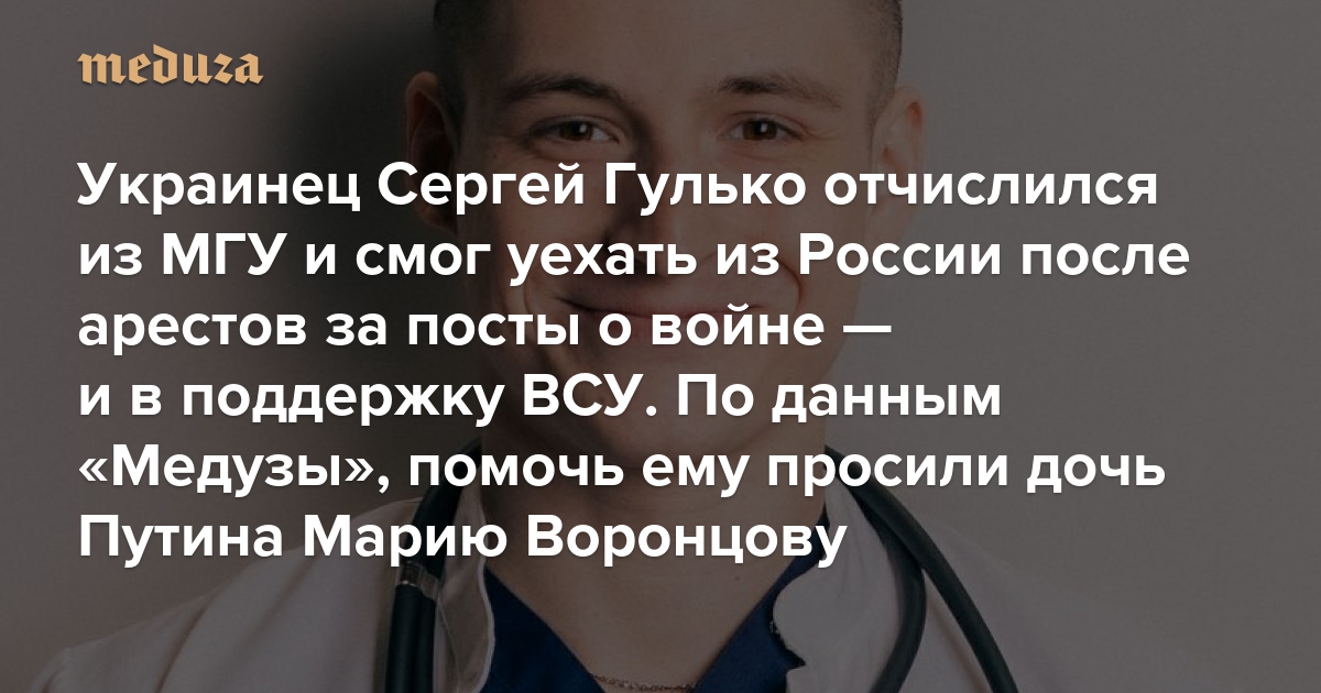 Украинец Сергей Гулько отчислился из МГУ и смог уехать из России после арестов за посты о войне — и в поддержку ВСУ. По данным «Медузы», помочь ему просили дочь Путина Марию Воронцову