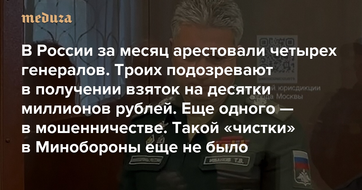 В структурах Минобороны России начались аресты — за месяц трех генералов, включая замминистра, задержали по подозрению в получении взяток, а бывшего командующего 58-й армией Ивана Попова — по обвинению в мошенничестве. 12 мая с поста главы министерства был снят Сергей Шойгу, занимавший эту должность в течение 12 лет. Его место занял Андрей Белоусов, бывший вице-премьер по экономическим вопросам. Пресс-секретарь президента Дмитрий Песков, комментируя аресты в министерстве, заявил о «последовательной борьбе с коррупцией» — хотя до этого таких «чисток» там не было. «Медуза» рассказывает, что известно об арестах в Минобороны.
