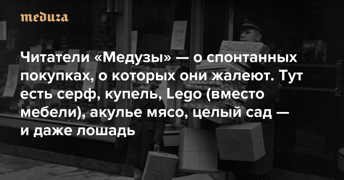 «Однажды я подарил своей бывшей девушке гуся» Читатели «Медузы» — о спонтанных покупках, о которых они жалеют. Тут есть серф, купель, Lego (вместо мебели), акулье мясо, целый сад — и даже лошадь