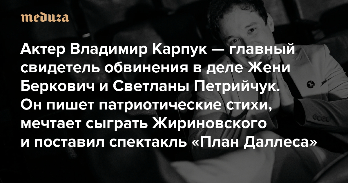 Актер Владимир Карпук — главный свидетель обвинения по делу Жени Беркович и Светланы Петрийчук Он пишет патриотические стихи, мечтает сыграть Жириновского и поставил спектакль «План Даллеса»