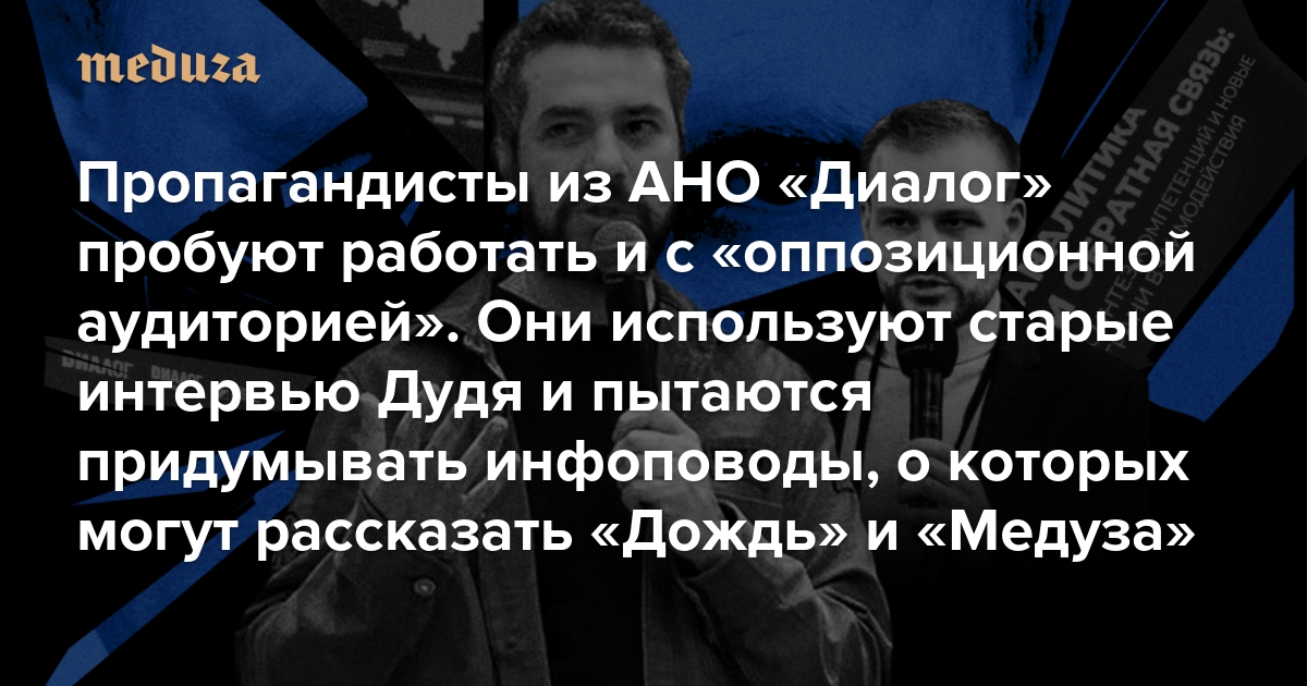 Пропагандисты из АНО «Диалог» решили попробовать работать и с «оппозиционной аудиторией» Для этого они используют старые интервью Дудя и пытаются придумывать инфоповоды, о которых могут рассказать «Дождь» и «Медуза»