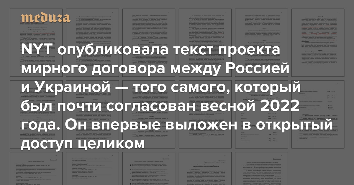 Газета The New York Times целиком опубликовала проект мирного соглашения между Россией и Украиной, к подписанию которого воюющие страны были близки в апреле 2022 года. Большинство деталей этого договора ранее были известны, однако сам текст документа публикуется впервые.