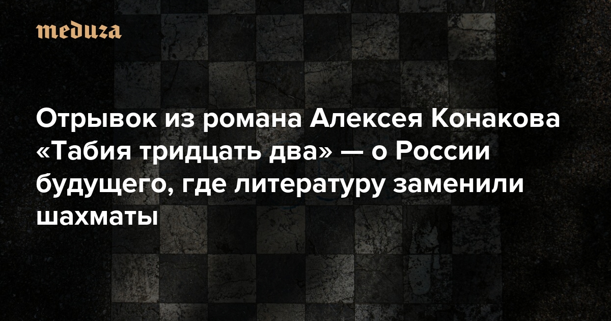 В издательстве Individuum вышел роман писателя и независимого исследователя позднесоветской культуры Алексея Конакова «Табия тридцать два». Действие происходит в России в 2081 году. Страна изолирована от внешнего мира — ООН наложила на нее карантин. С подачи академика Дмитрия Александровича Уляшова новая власть объявила источником всех бед классическую русскую литературу. Теперь вместо художественных текстов россияне массово изучают шахматы. С разрешения Individuum «Медуза» публикует отрывок из романа: в нем академик Уляшов объясняет аспиранту Кириллу, что же не так с отечественной литературой.