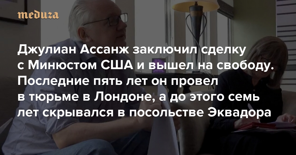 Джулиан Ассанж заключил сделку с Минюстом США и вышел на свободу Последние пять лет он провел в тюрьме в Лондоне, а до этого семь лет скрывался в посольстве Эквадора