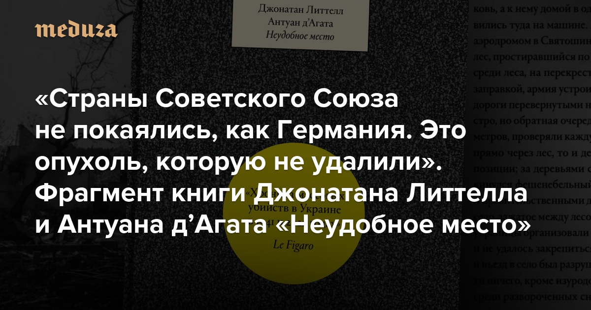 «Страны Советского Союза не покаялись, как Германия. Это опухоль, которую не удалили» Фрагмент книги Джонатана Литтелла и Антуана дʼАгата «Неудобное место» о преступлениях РФ в Украине. Это первая переводная книга издательства «Медузы»