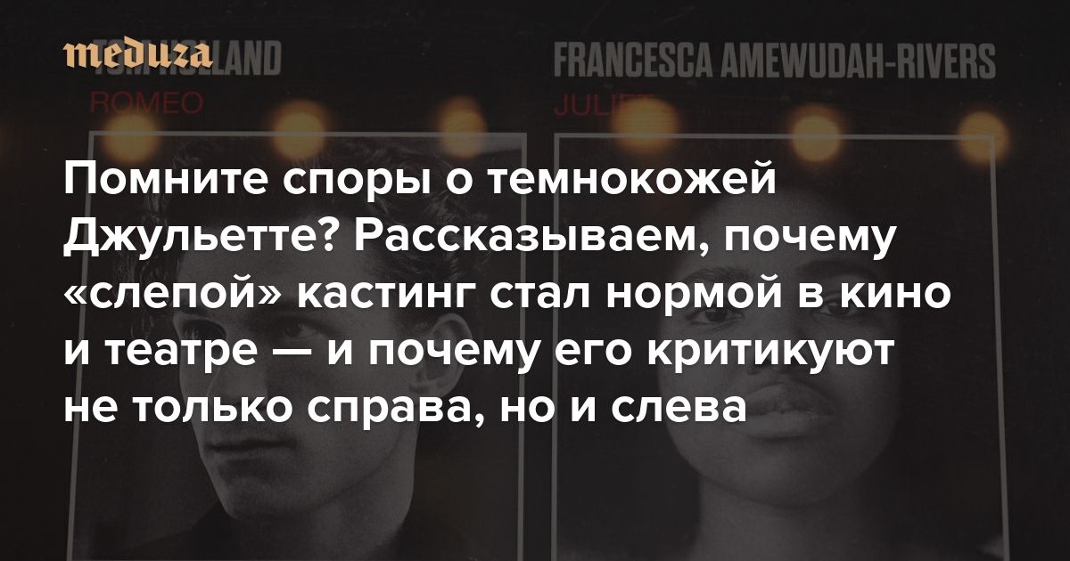 В театре герцога Йоркского в Лондоне идет «Ромео и Джульетта» — спектакль Джейми Ллойда с Томом Холландом и Франческой Амевуда-Риверс в заглавных ролях. Промо-кампания этого проекта вызвала в соцсетях — в том числе русскоязычных — очередную дискуссию о темнокожих артистах, которые играют белых персонажей: Амевуда-Риверс — как раз темнокожая. Споры о colorblind-кастинге настолько же привычны, как и сам этот подход к подбору актеров: о нем даже делают мемы. Разбираемся, откуда взялся «слепой» кастинг, почему он важен и когда бывает неуместен.