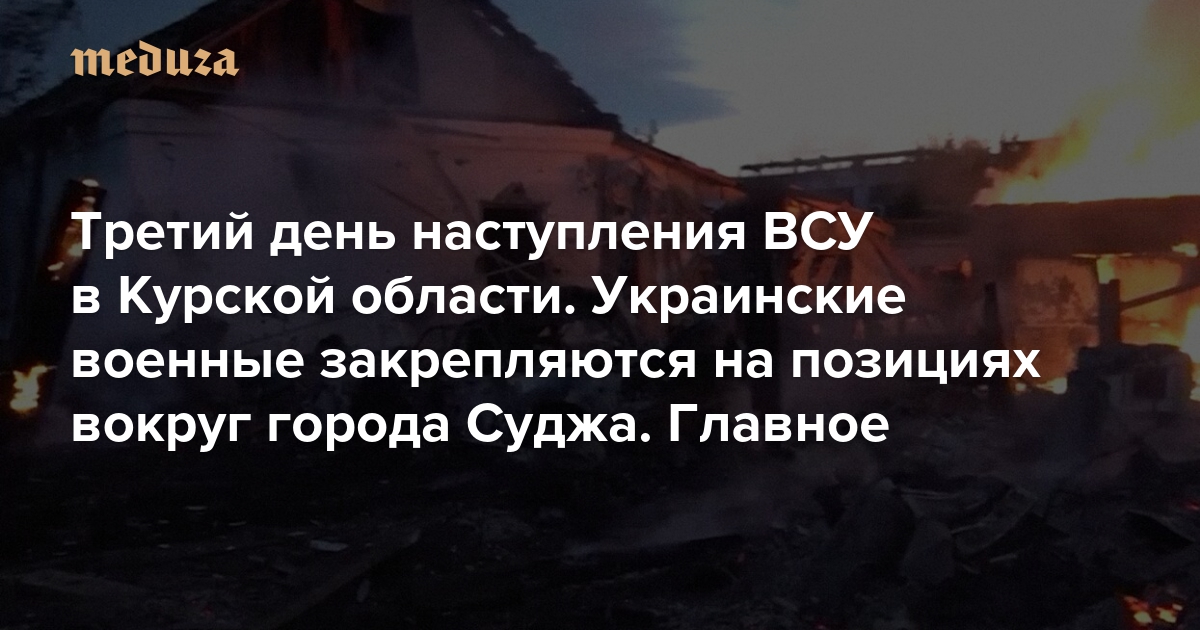 В Курской области третий день продолжается наступление ВСУ, начавшееся 6 августа. По информации провоенных пабликов, украинские военные зашли в приграничный город Суджа. Однако, судя по видеозаписям местных жителей, которые изучила «Медуза», бойцы ВСУ утром 8 августа находились вокруг города, но в сам центр пока не вошли, при этом российских военных на записях также не видно. Телеграм-канал «Рыбарь», близкий к Минобороны РФ, пишет, что в Судже «остаются отдельные очаги сопротивления», в основном, это местные жители, «но сам город практически под полным контролем ВСУ». Утверждается, что подразделения ВСУ контролируют кольцевую развязку к северо-востоку от города.