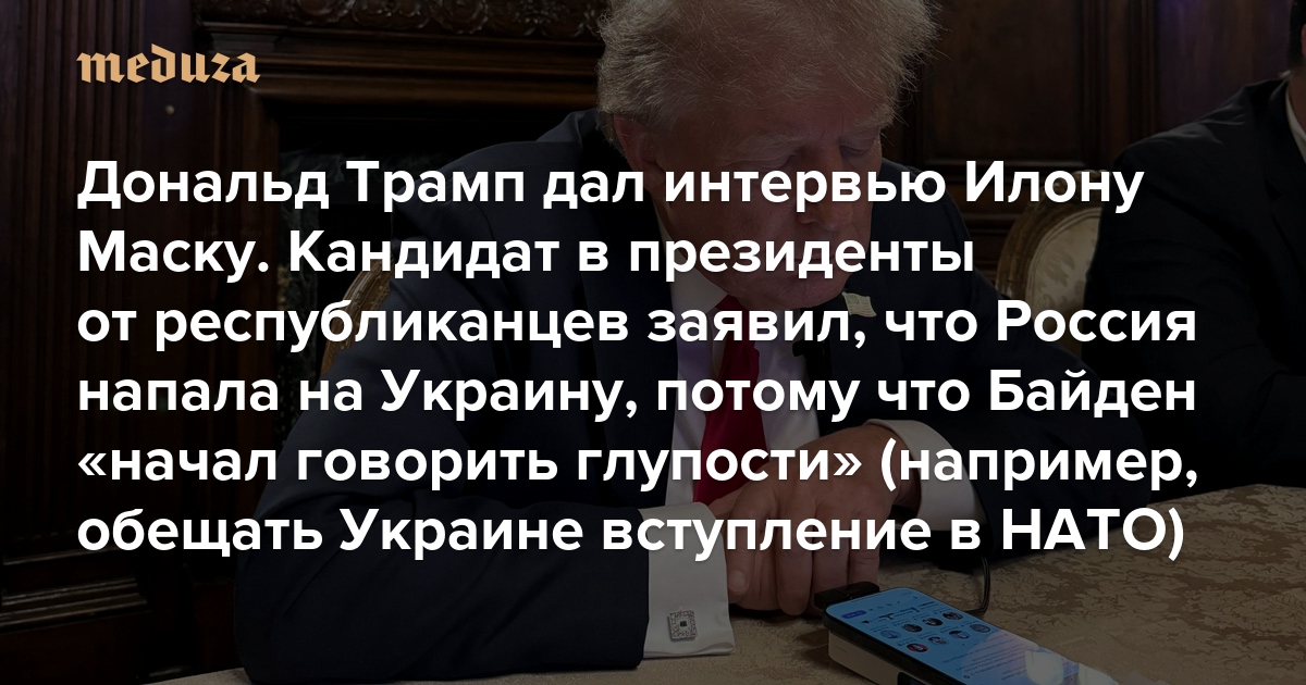 Дональд Трамп дал интервью Илону Маску Кандидат в президенты от республиканцев заявил, что Россия напала на Украину, потому что Байден «начал говорить глупости» (например, обещать Украине вступление в НАТО)