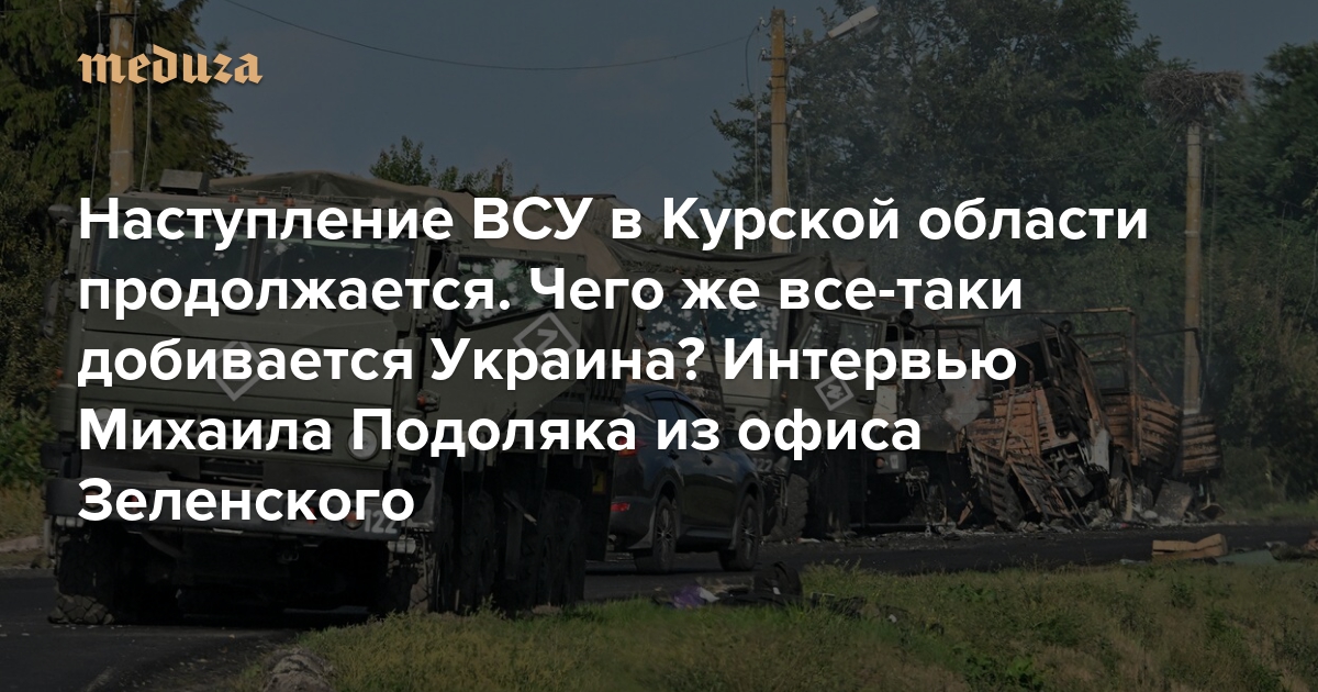 Больше недели российские войска не могут остановить наступление ВСУ на собственной земле, в Курской области. Все это время украинские власти комментируют операцию предельно сдержанно — среди прочего до сих пор не ясна конечная цель наступления (хотя есть много неофициальных версий). О том, как успехи ВСУ на российской территории могут отразиться на ходе войны в целом, «Медуза» поговорила с советником главы офиса Владимира Зеленского Михаилом Подоляком.