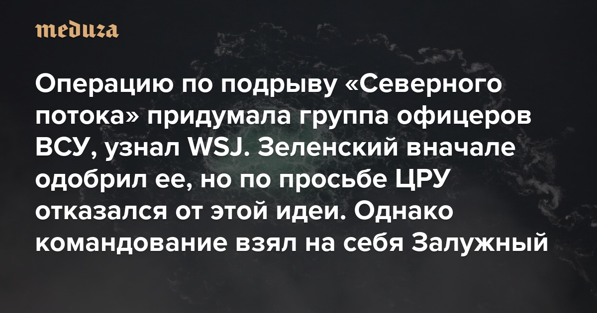 Операцию по подрыву газопроводов «Северный поток — 1» и «Северный поток — 2» в Балтийском море придумала в мае 2022 года группа украинских офицеров, выяснила газета The Wall Street Journal. Владимир Зеленский вначале одобрил план, но ЦРУ, узнав об этом, попросило его отказаться от проведения операции. Президент Украины потребовал остановить подготовку, однако Валерий Залужный, занимавший на тот момент пост главнокомандующего ВСУ, проигнорировал приказ. Журналисты The Wall Street Journal поговорили с четырьмя высокопоставленными украинскими чиновниками и военными, которые участвовали в планировании операции или знали о ней, а также с американскими и немецкими источниками и подробно рассказывает, как готовился подрыв газопроводов.