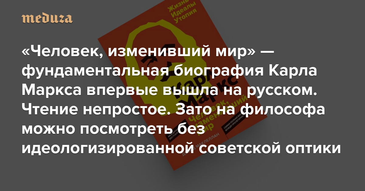 В издательстве «Азбука-Аттикус» вышел русский перевод, вероятно, самой фундаментальной биографии Карла Маркса — «Человек, изменивший мир. Жизнь. Идеалы. Утопия» Дэвида Маклеллана. По-английски его книга переиздавалась четыре раза без особых изменений. Сегодня история жизни основателя марксизма особенно актуальна не только для россиян (российская пропаганда активно отменяет создателя коммунизма как западного мыслителя), так и для всего мира, где вновь набирает вес левое движение. «Медуза» рассказывает, зачем читать этот непростой текст.
