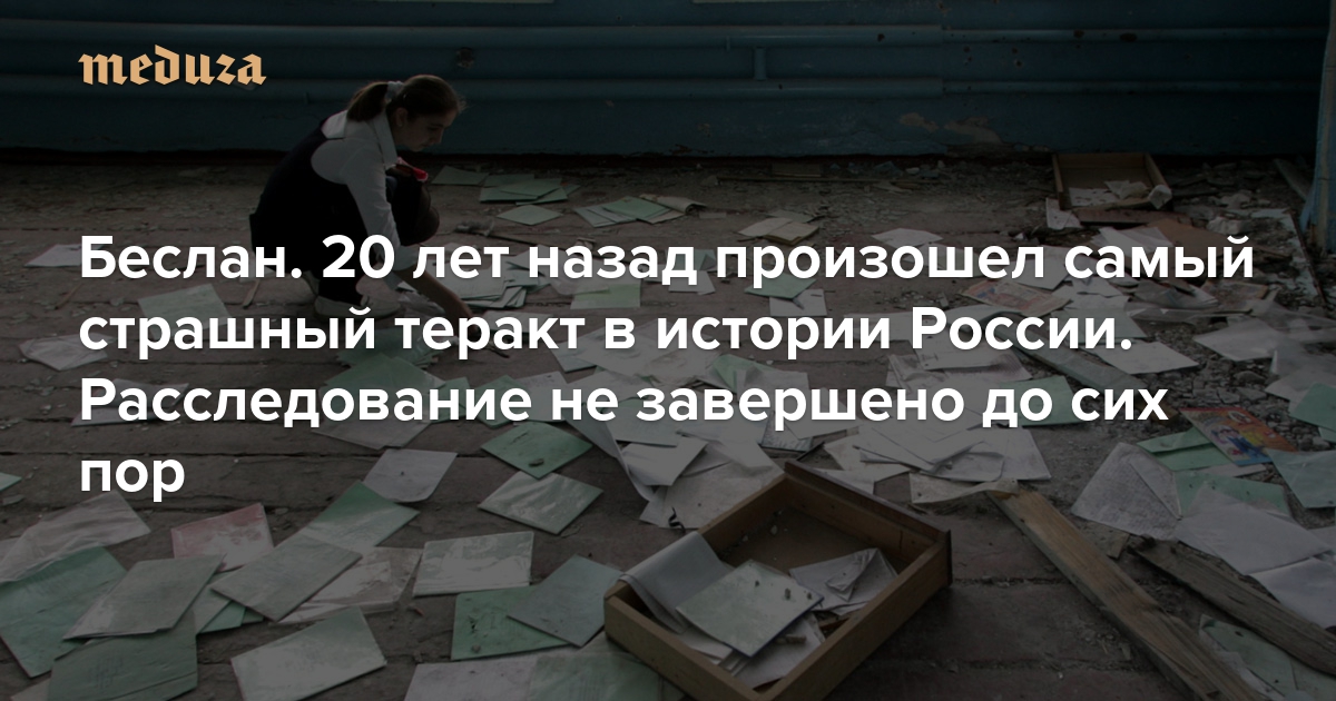 Двадцать лет назад произошел самый страшный теракт в истории современной России. 1 сентября 2004 года группа террористов захватила школу № 1 города Беслан в Северной Осетии, когда там шла торжественная линейка в честь Дня знаний. Боевики согнали школьников, родителей и учителей в спортзал и удерживали их там в заложниках два с половиной дня без еды и воды. В заминированной террористами школе находились 1128 человек, в основном дети. При этом власти постоянно занижали число заложников в новостях. Ответственность за организацию теракта взял на себя лидер чеченских сепаратистов Шамиль Басаев. Днем 3 сентября в спортзале произошли взрывы, после чего спецслужбы пошли на штурм школы. К вечеру 3 сентября силовики отчитались об уничтожении 31 террориста, один из боевиков — Нурпаша Кулаев — был взят живым и впоследствии приговорен к пожизненному заключению. В результате теракта погибли 333 человека, в том числе 186 детей. Не менее 783 человек получили ранения различной степени тяжести. Российские власти не любят лишний раз вспоминать о Беслане. Владимир Путин за время своего правления лишь дважды приезжал в город, и никогда в годовщины теракта. В 2024-м президент посетил Беслан 20 августа. 3 сентября, в 20-ю годовщину освобождения заложников, он будет с визитом в Монголии. Официальное расследование теракта до сих пор не завершено. «Медуза» напоминает, как развивались события 1–3 сентября 2004 года в Беслане.