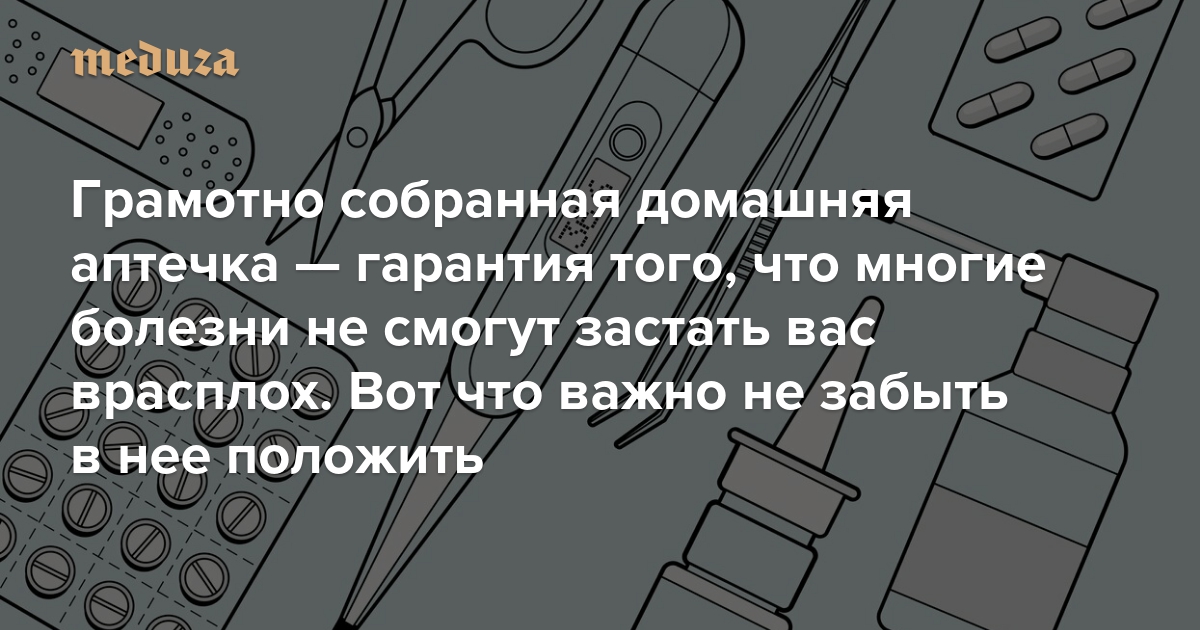 Грамотно собранная домашняя аптечка — гарантия того, что многие болезни не смогут застать вас врасплох. Вот что важно не забыть в нее положить Чек-лист «Медузы»