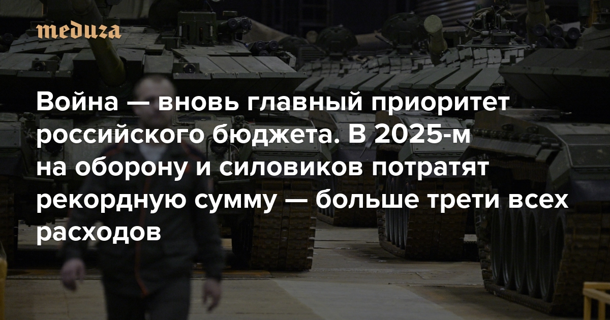 Война — вновь главный приоритет российского бюджета. В 2025-м на оборону и силовиков потратят рекордную сумму — больше трети всех расходов Оплачивать это будут граждане и бизнес — через рост налогов
