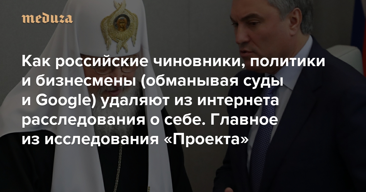 Как российские чиновники, политики и бизнесмены (обманывая суды и Google) удаляют из интернета расследования о себе В этом им помогают сын бывшего пресс-секретаря Шойгу и друг Пескова. Главное из исследования «Проекта»