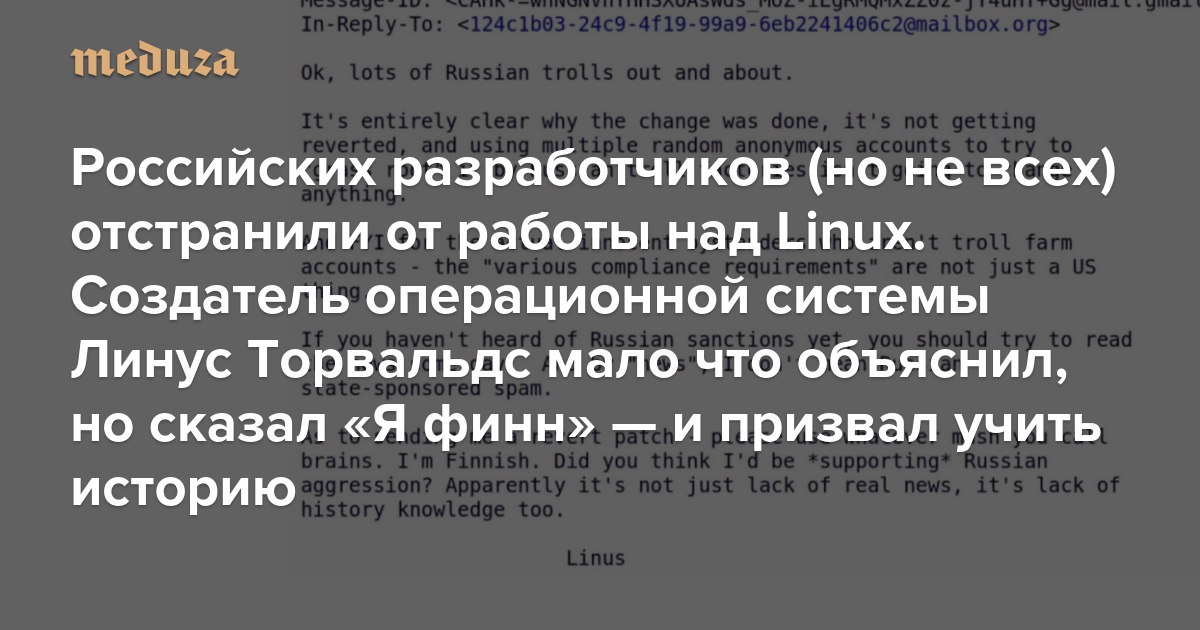 Российских разработчиков (но не всех) отстранили от работы над Linux. Создатель операционной системы Линус Торвальдс мало что объяснил, но сказал «Я финн» — и призвал учить историю