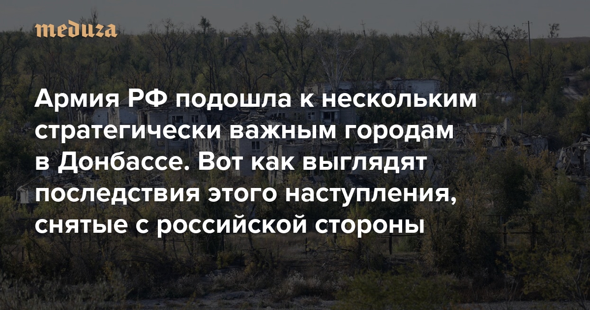 Российские войска продолжают наступать на фронте в Донбассе. В недавней военной сводке «Медуза» пишет, что к 24 октября они достигли промежуточных целей сразу нескольких операций в Донецкой области, где сейчас идут наиболее ожесточенные бои. Армия РФ подошла к Торецку, окружила Селидово и проникла в Курахово, а также готовится к штурму города-крепости Часов Яр с юга. На этой неделе (наверное, самой тяжелой для ВСУ за последний год) были опубликованы редкие кадры с фронта, снятые российской стороной. На них видны последствия боев в городах и селах Донецкой области.
