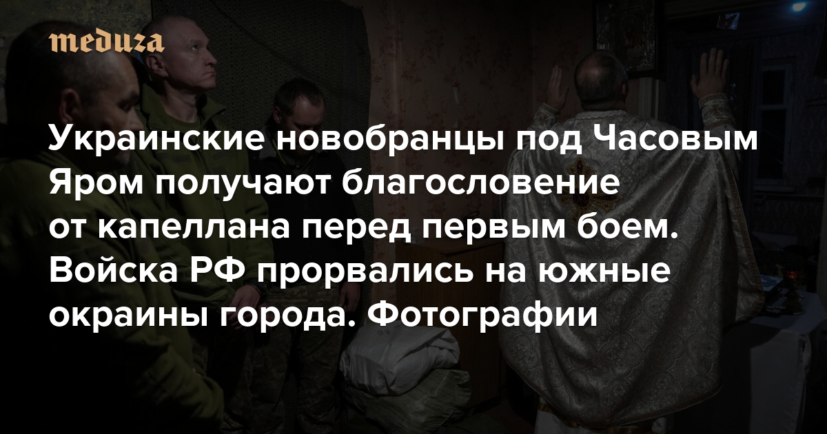 Войска РФ в начале ноября прорвались на южные окраины Часова Яра. Бои, как пишет «Медуза» в новой военной сводке, идут вдоль дороги Часов Яр — Константиновка, критически важной для снабжения гарнизона города. Украинские военные продолжают держать оборону на подступах к Часову Яру. В боях, в числе прочих, участвуют новобранцы 24-й отдельной механизированной бригады ВСУ. Перед первым боевым заданием они получают благословение от армейского капеллана Юрия. Фотографии, которые публикует «Медуза», были сделаны 3 ноября 2024 года.