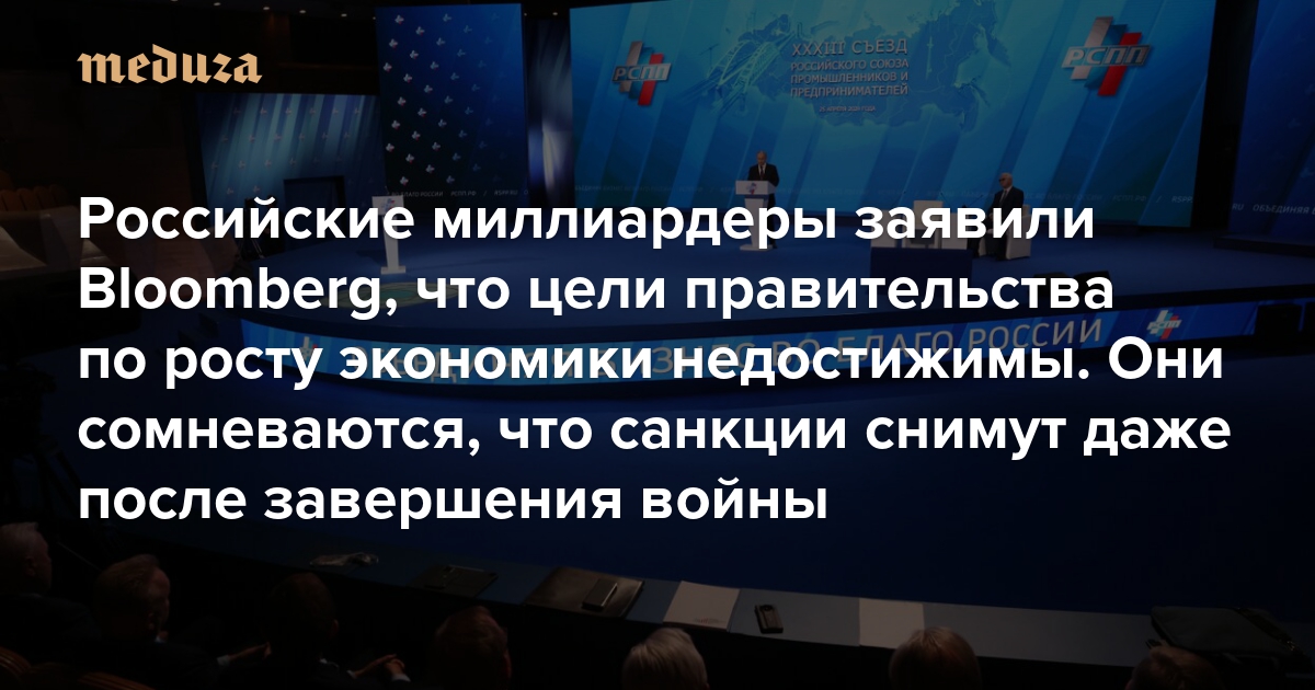 Российские миллиардеры заявили Bloomberg, что цели правительства по росту экономики недостижимы. Они сомневаются, что санкции снимут даже после завершения войны