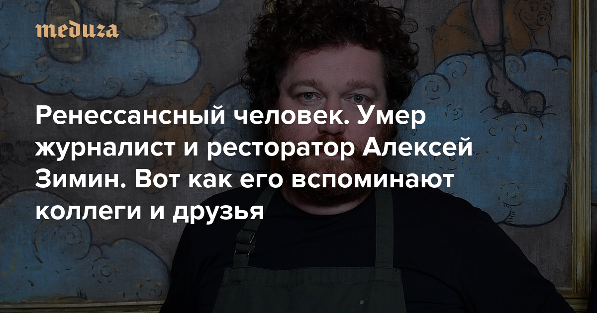 Журналист, шеф-повар и ресторатор Алексей Зимин умер в возрасте 52 лет. Его нашли мертвым в отеле в Белграде. Причина смерти не называется. Зимин работал в издательском доме «Афиша», создал проект «Афиша Еда», был главным редактором журналов GQ и Gourmet, а также сотрудничал с «Коммерсантом» и «Ведомостями». Зрителям телеканалов НТВ, СТС и «Домашний» Зимин также известен как ведущий авторского кулинарного шоу. Он открыл в Москве несколько кафе и ресторанов, а с 2015 года занимался ресторанным и медиапроектом Zima в Лондоне. Зимин — автор нескольких сборников рецептов и романа «Единицы условности». Летом 2024 года вышла его последняя книга «Англомания», посвященная Великобритании. В последние месяцы Зимин представлял ее в разных городах Европы, в том числе в Белграде. Вот как коллеги и друзья вспоминают Алексея Зимина.