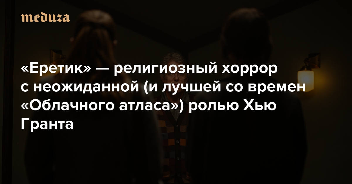 В российских кинотеатрах выходит «Еретик» — новый хоррор студии А24, снятый сценаристами «Тихого места» Брайаном Вудсом и Скоттом Беком. Фильм рассказывает о двух молодых мормонских миссионерках, которые оказываются в доме педантичного и циничного мужчины, решающего испытать их веру. Кинокритик «Медузы» Антон Долин считает, что это самая яркая роль Хью Гранта за последние 12 лет, а сама картина хоть и пытается казаться чересчур заумной, вполне может доставить удовольствие не только поклонникам фильмов ужасов.