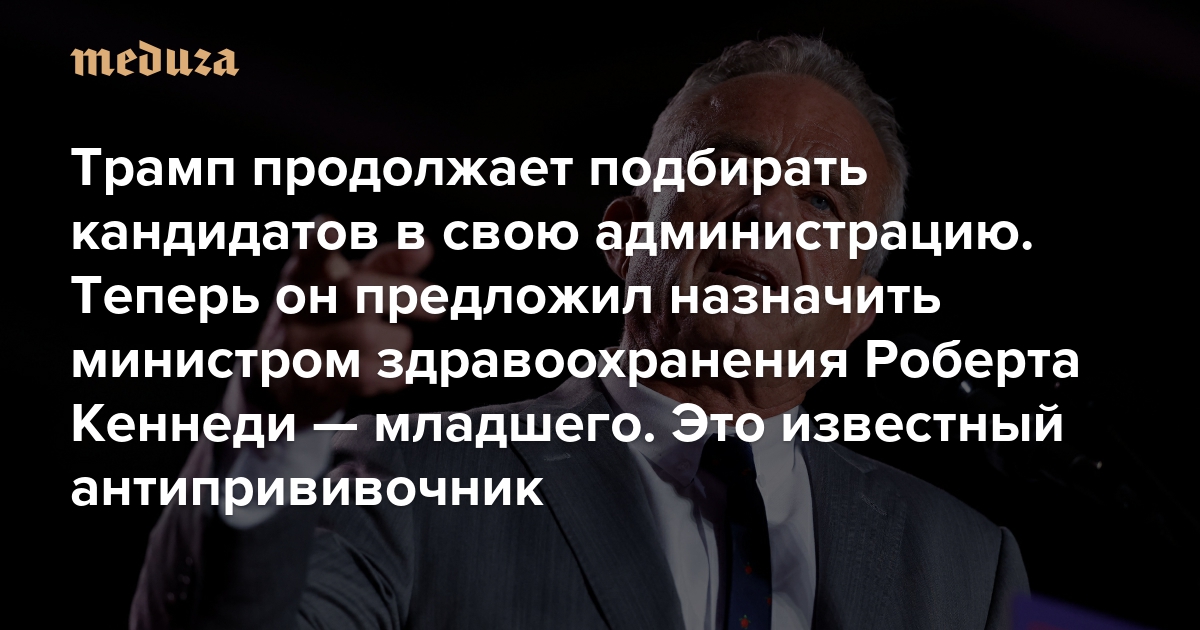 Трамп продолжает подбирать кандидатов в свою администрацию. Теперь он предложил назначить министром здравоохранения Роберта Кеннеди — младшего. Это известный антипрививочник