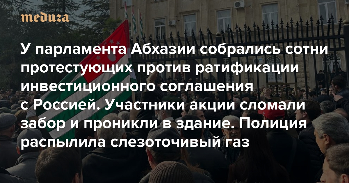 У парламента Абхазии собрались сотни протестующих против ратификации инвестиционного соглашения с Россией Участники акции сломали забор и проникли в здание. Полиция распылила слезоточивый газ