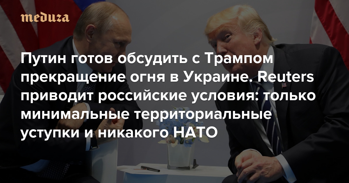 Путин готов обсудить с Трампом прекращение огня в Украине. Reuters приводит российские условия: только минимальные территориальные уступки и никакого НАТО