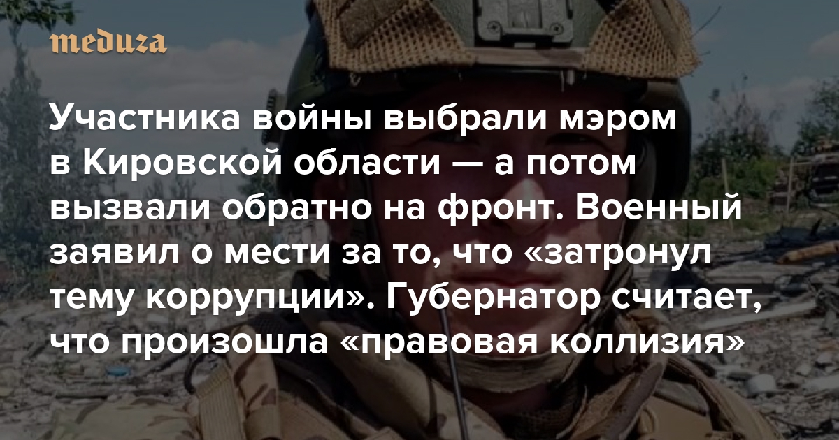 Участника войны выбрали мэром в Кировской области — а через три месяца вызвали обратно на фронт Военный заявил о мести за то, что «затронул тему коррупции». Губернатор считает, что произошла «правовая коллизия»