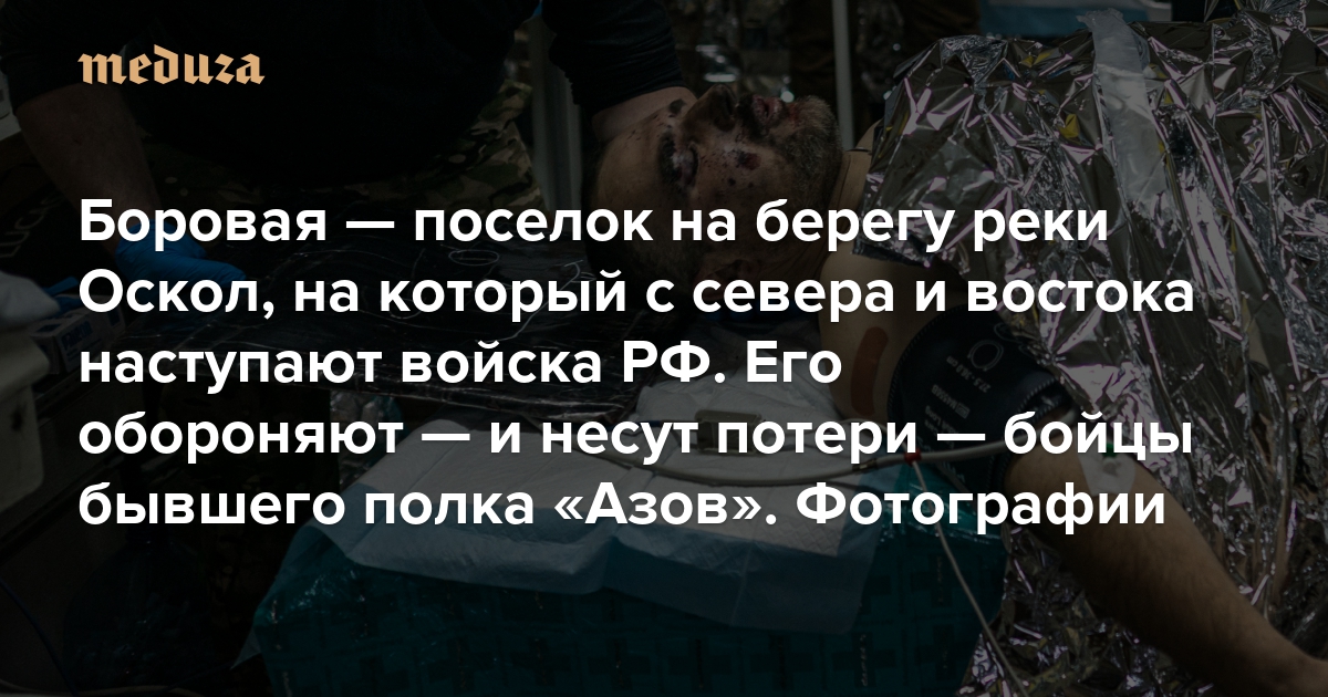 Боровая — поселок в Изюмском районе Харьковской области — цель российского наступления на границе Донецкой и Харьковской областей. Войска РФ наступают на поселок с севера и с востока. Боровую, расположенную на левом берегу реки Оскол, обороняет украинская 3-я отдельная штурмовая бригада, созданная на базе полка "Азов". Заместитель командира этого подразделения Родион Кудряшов объяснял в эфире телемарафона, что потеря поселка «сделает невозможным присутствие Вооруженных сил Украины на том берегу реки». «Поэтому и вся упорная борьба идет непосредственно за этот поселок», — говорил он. Интенсивные бои на этом участке фронта, отметил он, продолжаются с лета. «В целом, противник эволюционирует, их подготовка становится немного лучше, их оснащение становится немного лучше. Но в целом ситуация не меняется», — заявил он. «Медуза» публикует фотографии украинских военных, пострадавших в боях за Боровую, сделанные в пункте стабилизации 3-й отдельной штурмовой бригады.
