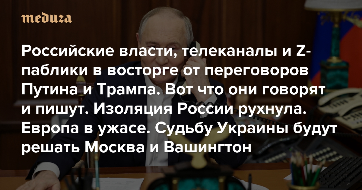 12 февраля Дональд Трамп и Владимир Путин провели телефонные переговоры. Это был первый разговор Путина с президентом США после его переизбрания на новый срок — и первый контакт с американским лидером после вторжения России в Украину. Путин должен быть доволен: Трамп перечеркнул политику изоляции России, говорил с ним полтора часа, объявил о начале мирных переговоров (о которых «проинформировал» Владимира Зеленского), анонсировал совместные встречи, назвал вступление Украины в НАТО «непрактичным», а ее возвращение к границам 2014 года — «маловероятным». Заявления президента США в Европе и Украине восприняли мрачно, а вот в России, без преувеличения, с ликованием. «Медуза» изучила, что российские власти говорят о переговорах Путина и Трампа и как эти переговоры подают телеканалы и Z-паблики в телеграме (мы пересказываем реакции с сокращениями, но не искажая смысл).