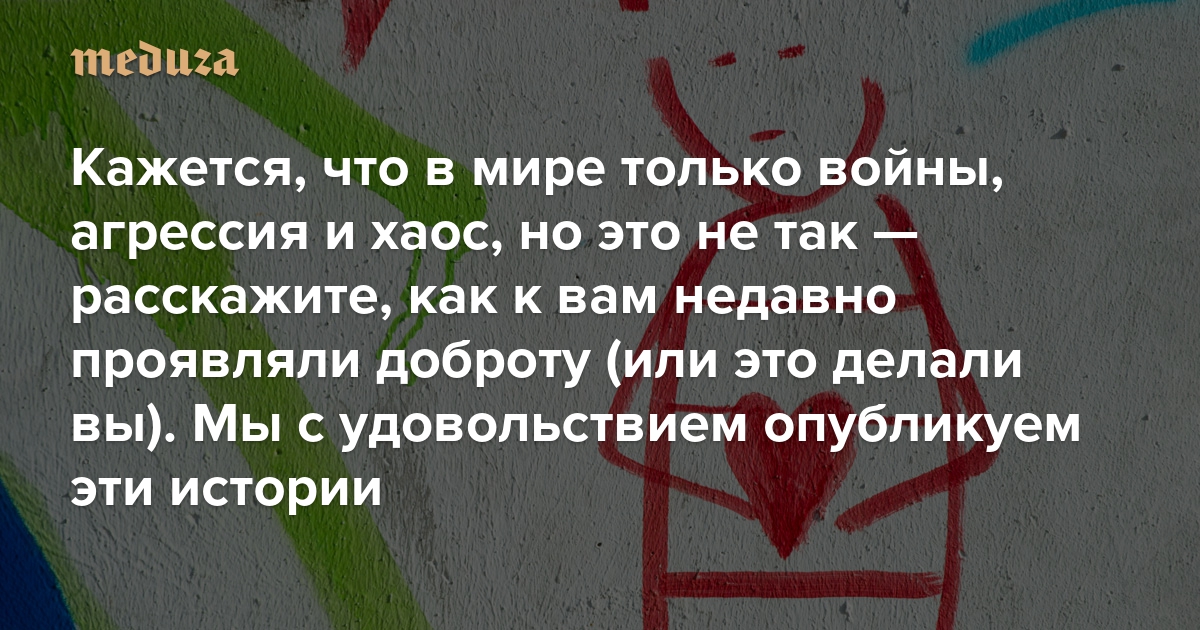 В мире гораздо больше доброты, чем можно представить, просматривая новости (кстати, если чтение новостей стало для вас проблемой, воспользуйтесь нашей инструкцией). Каждый день люди совершают добрые поступки. Это может быть что-то совсем крошечное: например, один человек уронил перчатку, а другой поднял ее и отдал. А может быть что-то серьезнее: кто-то пускает к себе пожить друга, который лишился работы, и дает ему столько времени на поиски нового источника дохода, сколько нужно. Мы рады будем историям любого масштаба! Часть из них мы опубликуем.