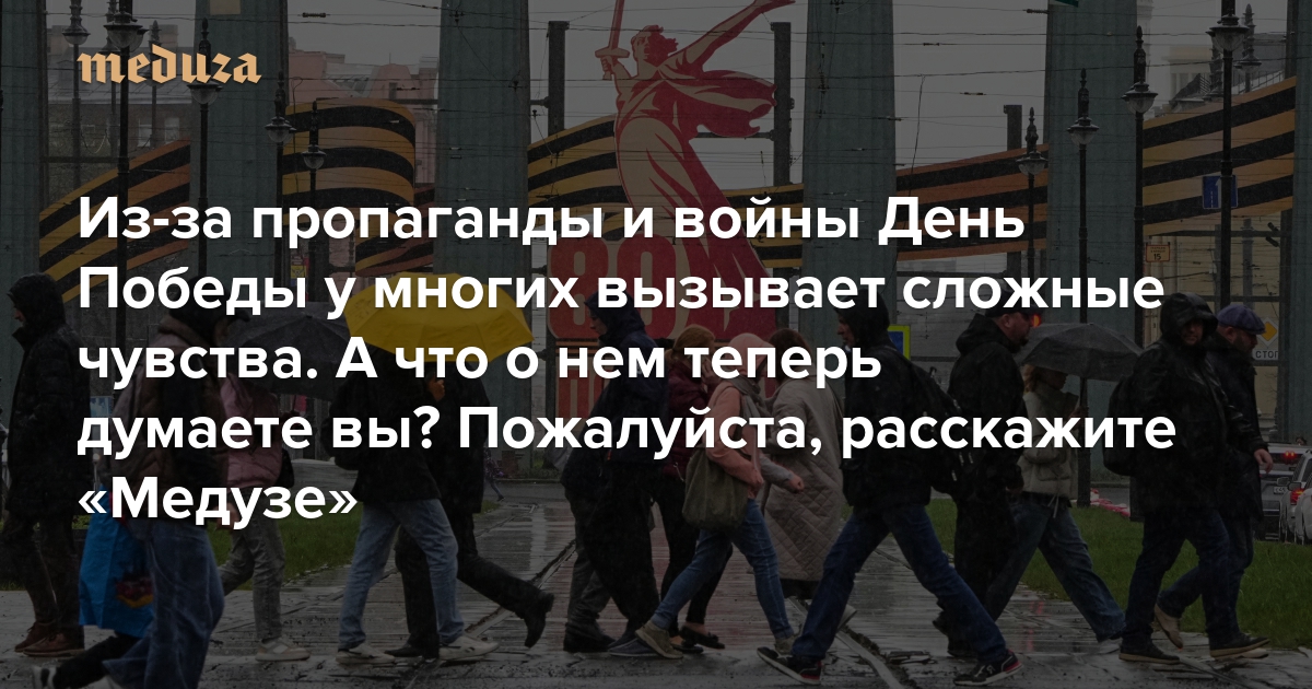 Из-за пропаганды и войны День Победы у многих вызывает сложные чувства. А что о нем теперь думаете вы? Пожалуйста, расскажите «Медузе» А еще поделитесь, что о 9 Мая говорят ваши близкие