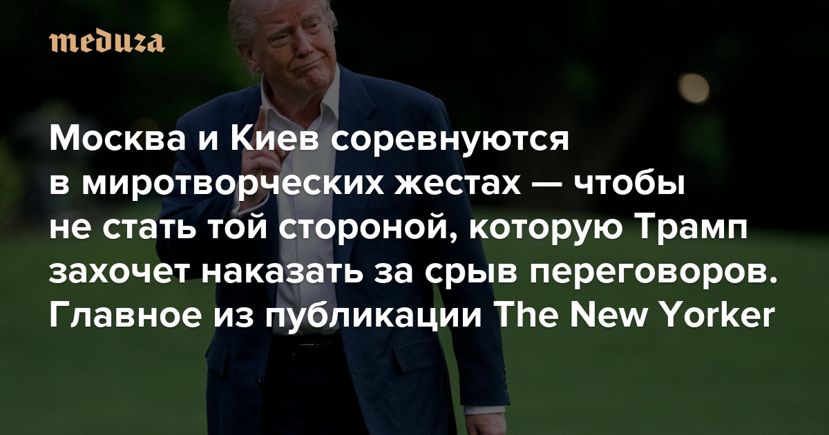 Москва и Киев соревнуются в миротворческих жестах — чтобы не стать той стороной, которую Трамп захочет наказать за срыв переговоров Главное из публикации The New Yorker