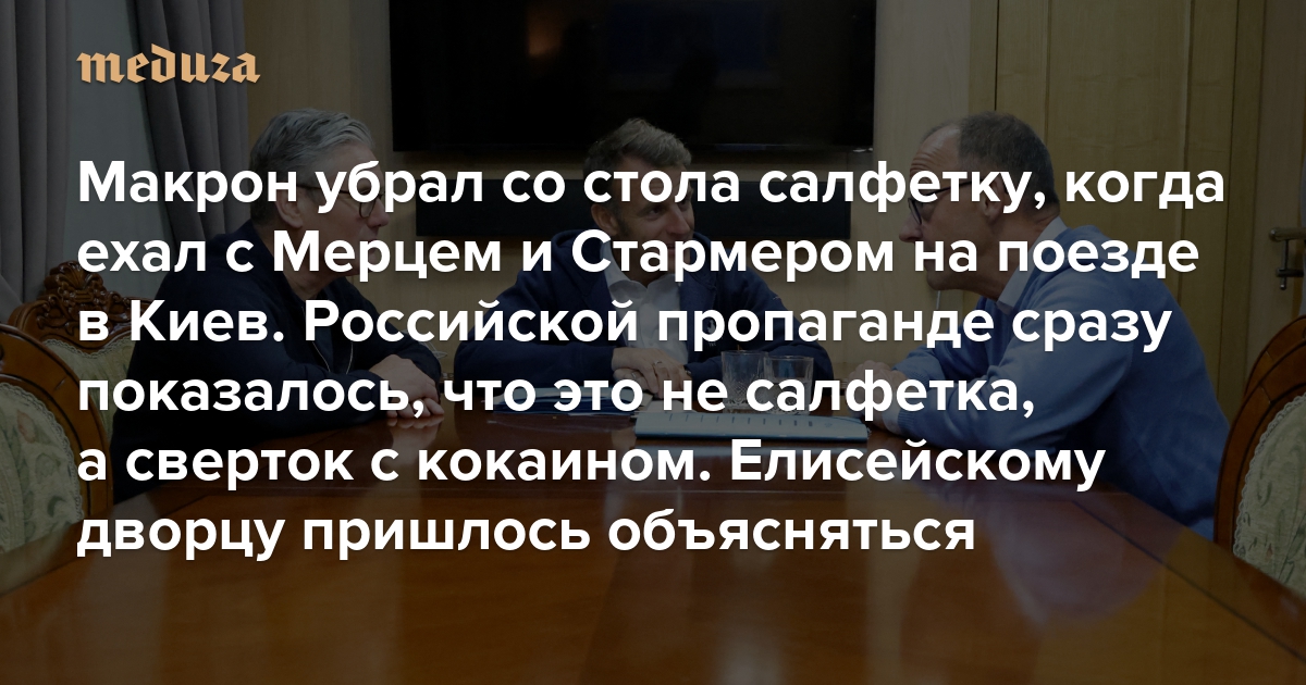 Макрон убрал со стола салфетку, когда ехал с Мерцем и Стармером на поезде в Киев. Российской пропаганде сразу показалось, что это не салфетка, а сверток с кокаином Елисейскому дворцу пришлось объясняться