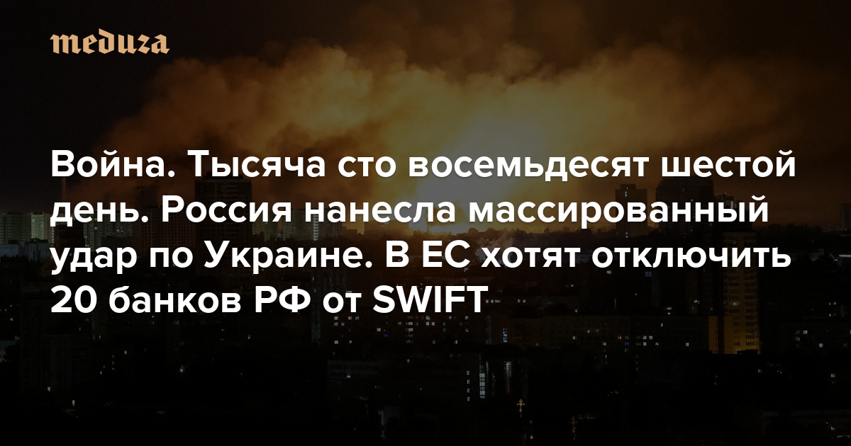 Война Тысяча сто восемьдесят шестой день. Россия нанесла массированный удар по Украине. В ЕС хотят отключить 20 банков РФ от SWIFT