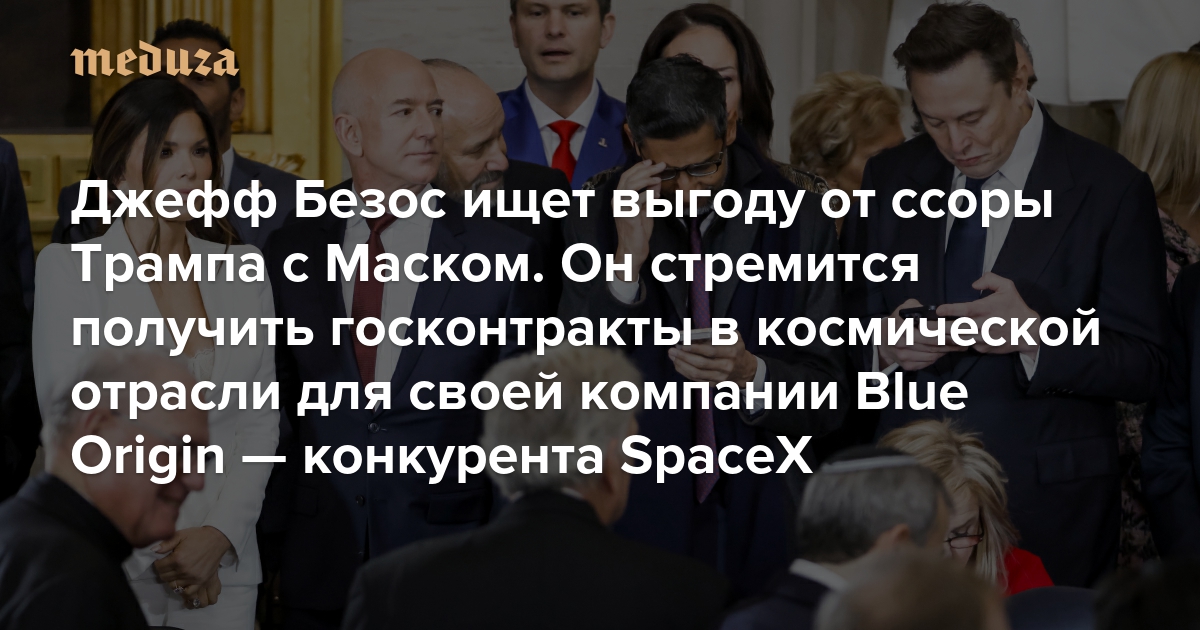 Джефф Безос ищет выгоду от ссоры Трампа с Маском Он стремится получить госконтракты в космической отрасли для своей компании Blue Origin — конкурента SpaceX