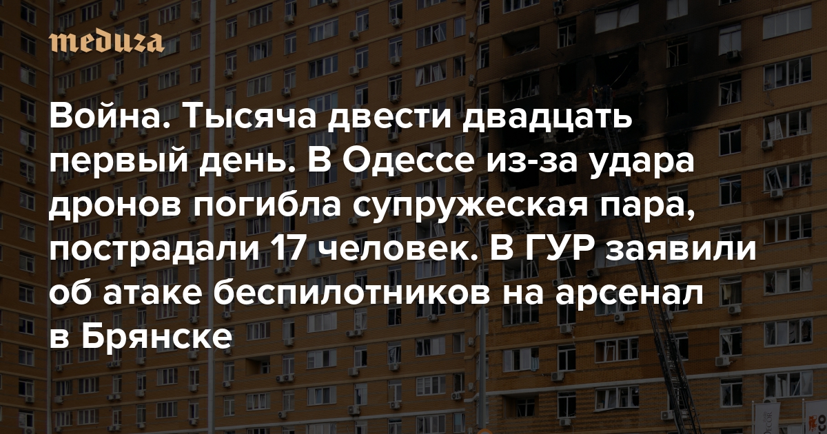 Война Тысяча двести двадцать первый день. В Одессе из-за удара российских дронов погибла супружеская пара, пострадали 17 человек. В ГУР Минобороны Украины заявили об атаке беспилотников на арсенал в Брянске