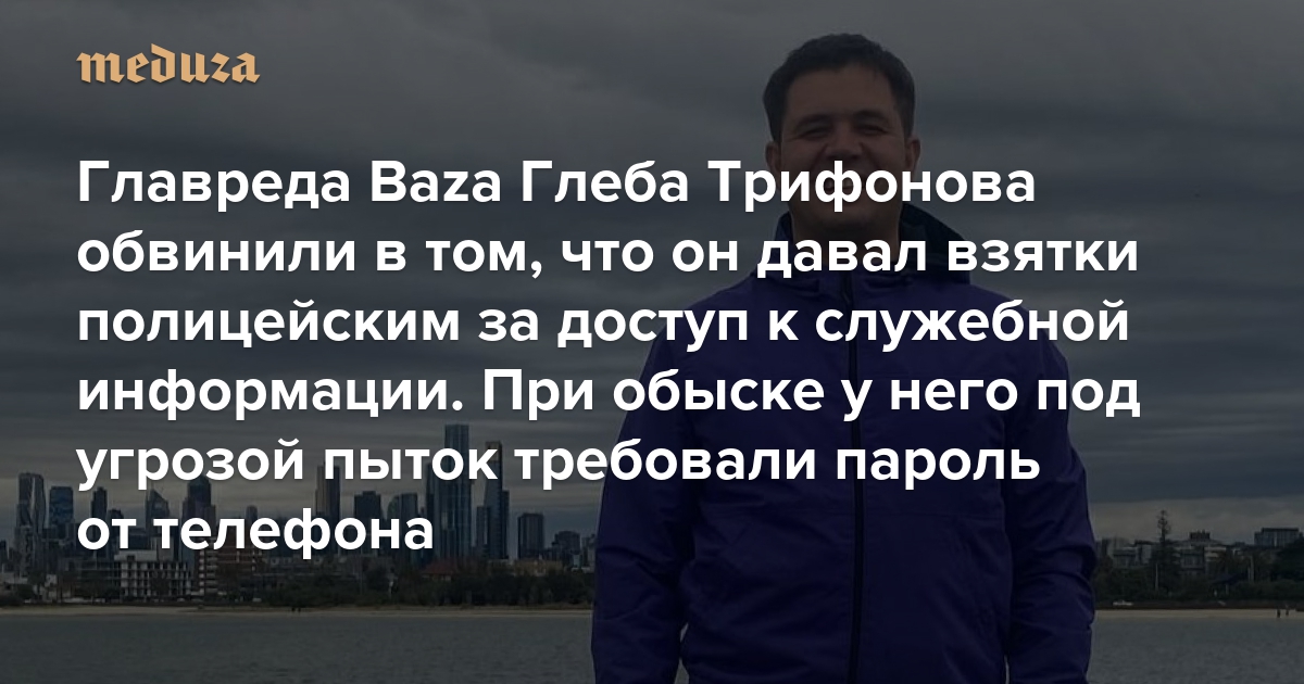 Главреда издания Baza Глеба Трифонова обвинили в том, что он давал взятки полицейским за доступ к служебной информации. При обыске у него под угрозой пыток требовали пароль от телефона