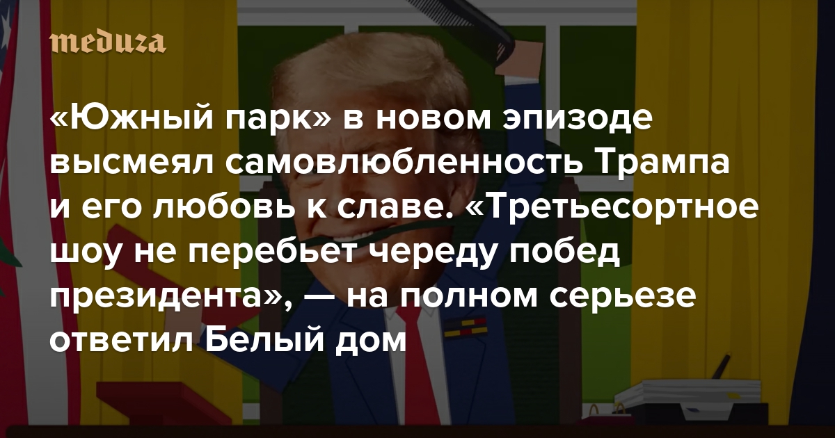 «Южный парк» в новом эпизоде высмеял самовлюбленность Трампа и его любовь к славе «Третьесортное шоу не перебьет череду побед президента», — на полном серьезе ответил Белый дом